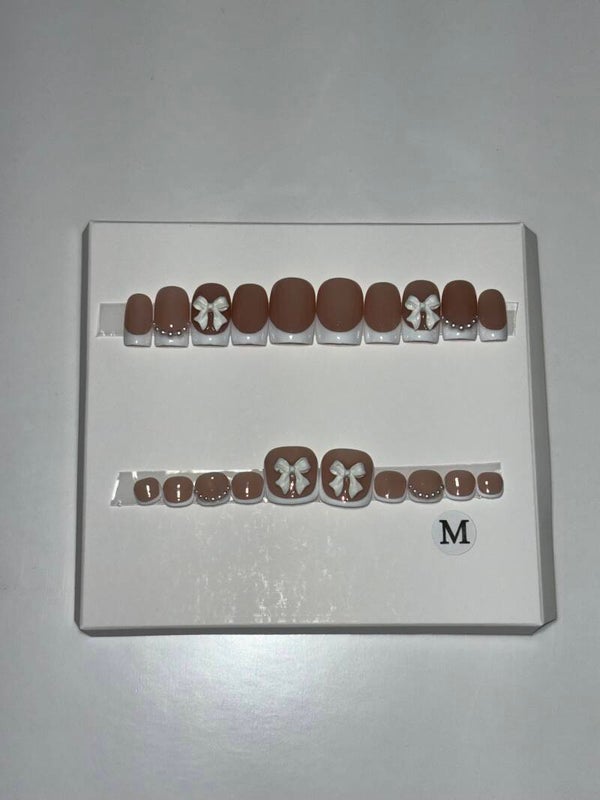Featuring a soft mocha base with delicate white French tips, these nails exude timeless elegance. Adorned with dainty 3D bows and tiny pearl accents, they bring the perfect balance of classy and cute. Whether you're dressing up for a special occasion or elevating your everyday style, this set is designed to make your nails look effortlessly chic.